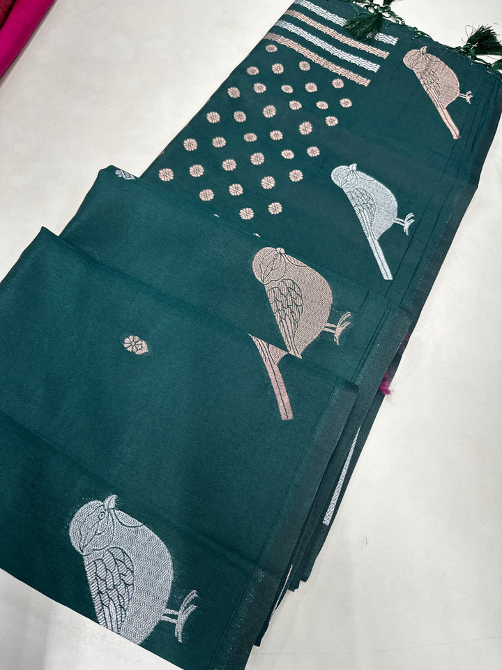Beautiful semi silk sari with all over thread weaving or Zari weaving. Butta comes with the pretty grand rich Pallu and a lovely plain blouse with border, each and every sari have a unique design and unique combo. Don’t miss this beautiful saree…. suitable for all your occasion.